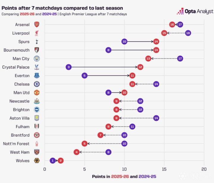根据Opta的统计数据,本赛季英超各队与上赛季前7轮后的积分情况形成鲜明对比:阿森纳减少了1个积分,利物浦减少了3个积分,水晶宫则以多出9个积分的表现成为进步最显著的球队,曼联也增加了2个积分。